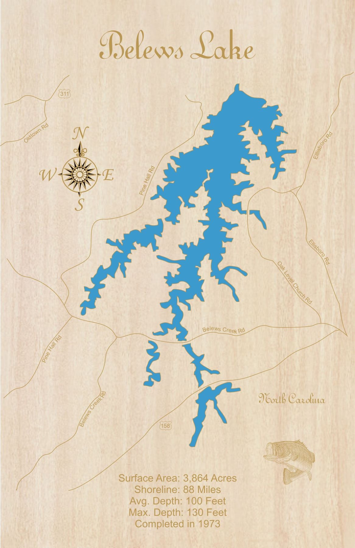Belews Lake 3D Custom Wood Map โ Lake Art LLC
