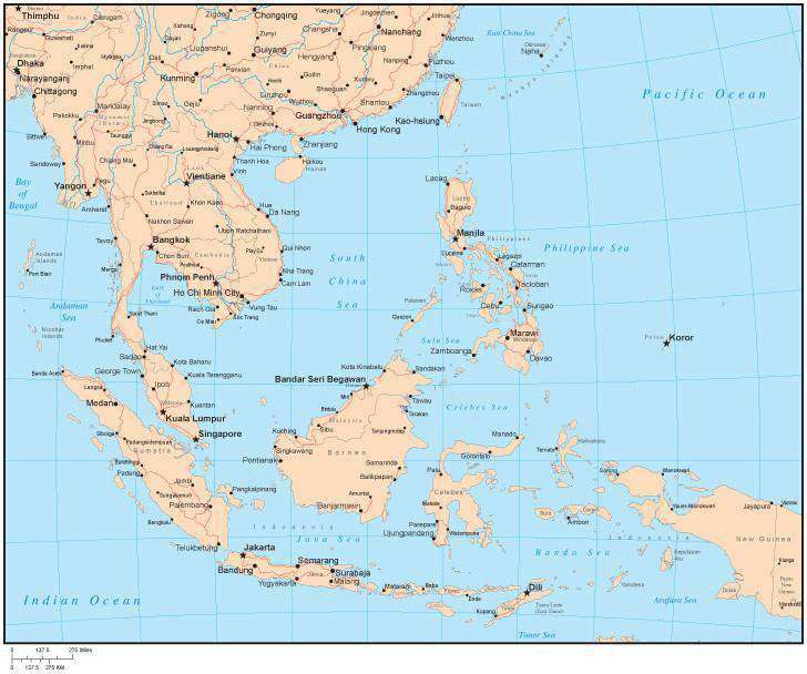 Single Color Southeast Asia Map with Countries, Capitals, Major Cities